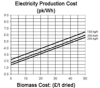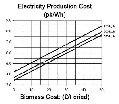 Electricity productions costs were calculated at 5.5p/kWh (£1300/kWe installed capital cost, feedstock cost £25/t) (see Figure 1) for the demonstration unit, higher than expected due to the use of 2 Iveco engines and the significant costs involved in the first grid connection. These were expected to drop by over 20% for subsequent projects as part of the ''learning'' curve.